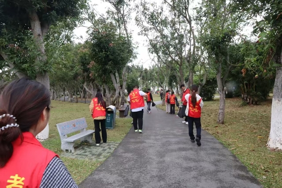 活动现场,志愿者们身着志愿服装,手持清洁工具,分工协作,默契配合,重点对园区道路两侧、草坪绿地、湖边栈道等休闲区域的塑料瓶、纸屑、烟蒂等生活垃圾进行清理,用实际行动美化公共环境,以志愿红守护生态绿。